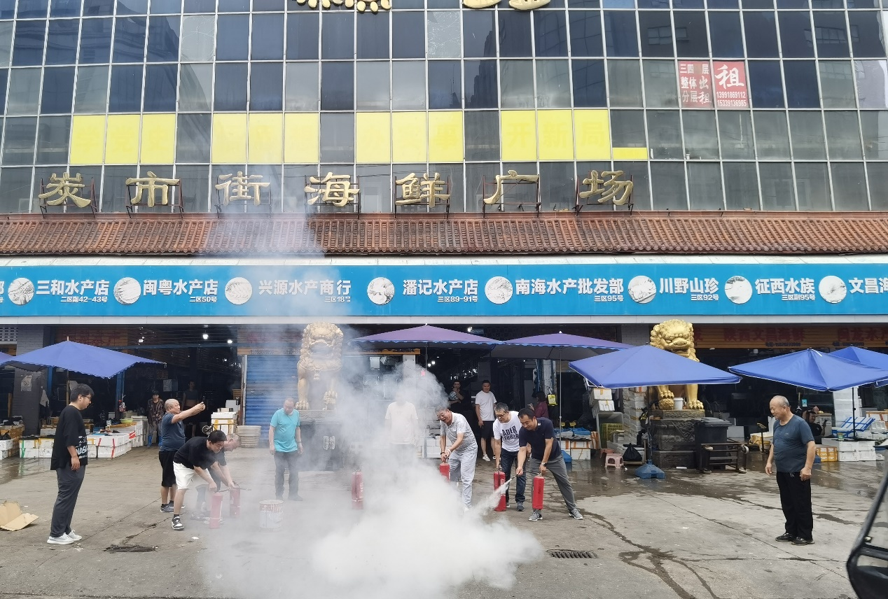 炭市街水產市場具有經營單位種類復雜、人流密集、消防隱患風險較高的特點。在演練現場,安全管理人員向各商戶代表詳細介紹了滅火器材的使用方法及操作要領。參練人員在安全員的指導下,分批有序使用滅火器材進行了現場滅火演習。